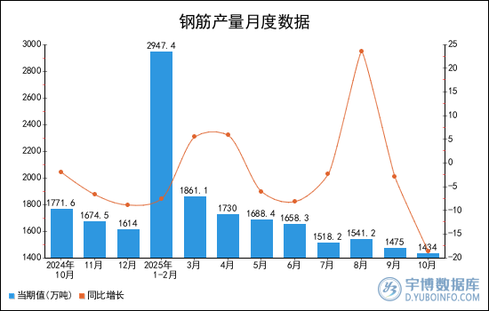 2025年1-10月全國鋼筋產量分月數據