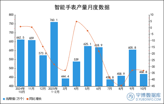 2025年10月全國智能手錶產量為468.8萬個,累計值為4973.9萬個,同比下降33%,累計下降27.2%。