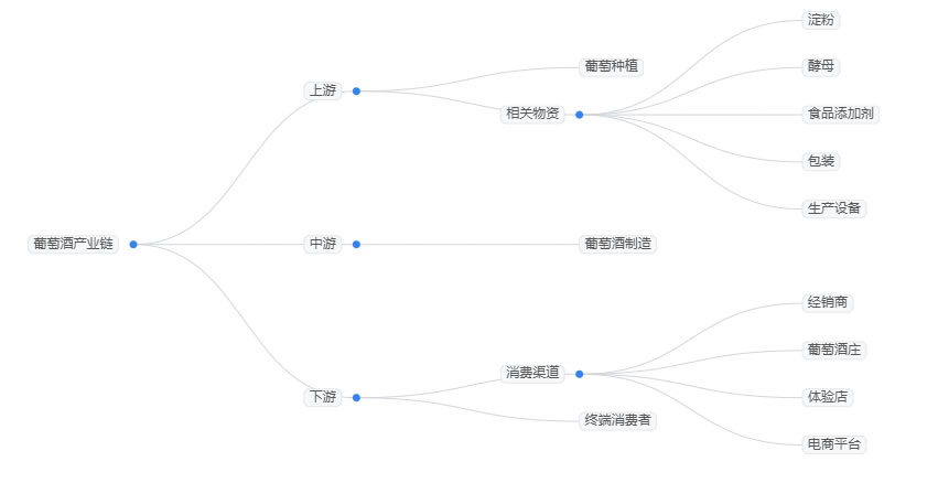 葡萄酒銷售渠道的格局重構加速,線上線下的融合與場景多元化成為關鍵特徵。全球葡萄酒供給體系在氣候壓力與技術升級的雙重作用下,呈現產區轉移與效率提升的新態勢。葡萄酒產業鏈中上游主要為葡萄的種植,此外還涉及澱粉、酵母、食品添加劑、包裝及生產設備等,中游為葡萄酒的製造,下游為消費渠道,具體有經銷商、葡萄酒莊、體驗店、電商平台等,最後到達終端消費者。