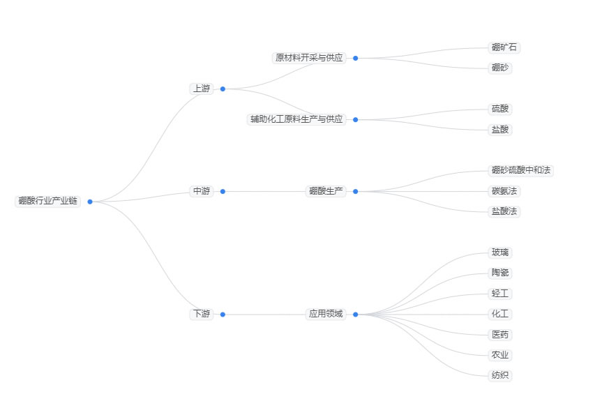 2026年硼酸行業政策聚焦資源保護、綠色生產與高端升級三大核心方向,各項政策的落地實施對行業供給結構、產能布局和產品質量產生深遠影響,多項關聯數據直觀反映政策驅動效應。硼酸行業產業鏈上游主要包括硼礦石、硼砂等原材料的開採與供應,同時還涉及硫酸、鹽酸等輔助化工原料的生產與供應。中游指硼酸的生產環節,主要是通過硼砂硫酸中和法、碳氨法、鹽酸法等多種工藝。硼酸應用領域廣泛,主要包括玻璃、陶瓷、輕工、化工、醫藥、農業、紡織等領域。現從三大方面來分析2026年硼酸行業政策。