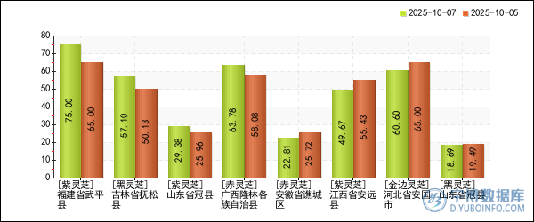 其中,福建省武平縣的紫靈芝價格漲幅最大,漲幅為15.38%,報75.00元/斤(2025年10月05日價格報65.00元/斤)。安徽省譙城區的赤靈芝的價格下跌幅度最大,跌幅為11.31%,報22.81元/斤(2025年10月05日價格報25.72元/斤)。