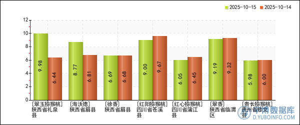 宇博智業監測數據顯示,2025年10月15日陝西省禮泉縣地區的翠玉獼猴桃價格漲幅最大,漲幅為54.97%,報9.98元/斤(2025年10月14日價格報6.44元/斤)。四川省蒼溪縣地區的紅陽獼猴桃價格跌幅最大,跌幅為6.93%,報9元/斤(2025年10月14日價格報9.67元/斤)。