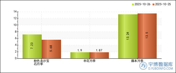 宇博智業監測數據顯示,2025年10月26日,全國52個主要的月季產地中,均價上漲的產地有3個,均價下跌的產地有2個。