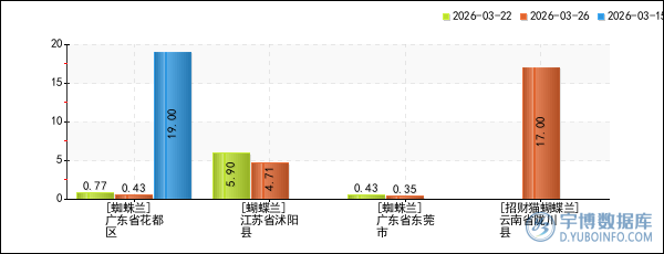 2026年03月26日,宇博智業大數據預警中心數據顯示,蘭花產品重點產地中,共有4家產地的多個品種價格較4周前(2026年02月26日)出現了下跌,平均下跌幅度為23.37%。其中,廣東省花都區的蜘蛛蘭、江蘇省沭陽縣的蝴蝶蘭價格下跌幅度較大,今日報價分別為0.43元/株、4.71元/株,較4周前(2026年02月26日)分別下跌了44.16%、20.17%,值得投資者重點關注。