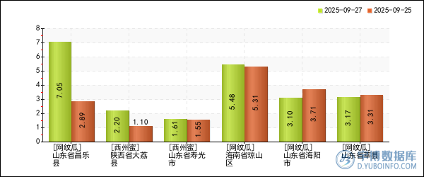 其中,山东省昌乐县的网纹瓜价格涨幅最大,涨幅为143.94%,报7.05元/斤(2025年09月25日价格报2.89元/斤)。山东省海阳市的网纹瓜的价格下跌幅度最大,跌幅为16.44%,报3.10元/斤(2025年09月25日价格报3.71元/斤)。