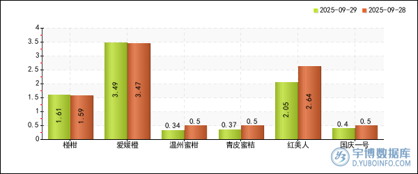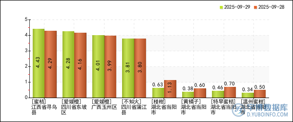 其中,江西省寻乌县的蜜桔价格涨幅最大,涨幅为3.26%,报4.43元/斤(2025年09月28日价格报4.29元/斤)。湖北省当阳市的椪柑的价格下跌幅度最大,跌幅为44.25%,报0.63元/斤(2025年09月28日价格报1.13元/斤)。