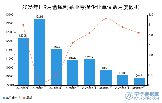 2025年9月金屬製品業虧損企業單位數本月末為9942個,增減2.6%。