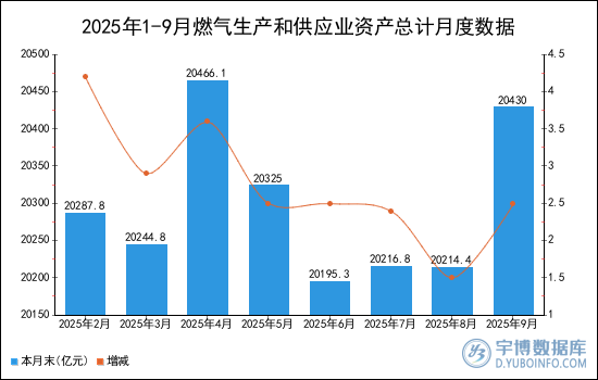2025年9月燃氣生產和供應業資產總計本月末為20430億元,增減2.5%。
